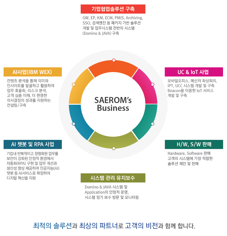 1994년 Lotus Notes Ver.3을 시작으로 현재까지 국내외 1,000여 고객사에 대한 구축 경험과 조직의 90%가 개발자인 전문가 인력구성을 토대로 가장 안정적인 사업 동반자로 입지를 굳힌 IT 전문기업 새롬정보시스템은 자체 개발한 "eMate" 제품군을 근간으로 고객사의 시스템 통합 및 어플리케이션 개발 및 공급 / Customizing / Data Migration 보안 등의 서비스를 제공합니다.