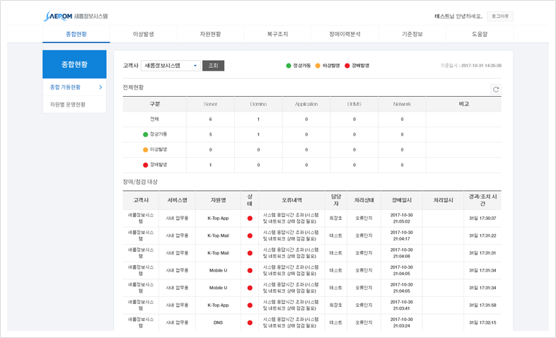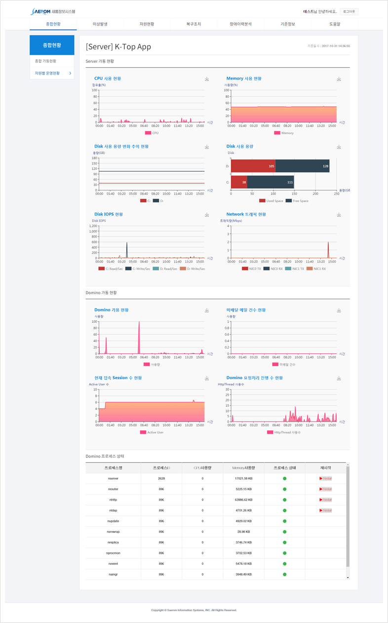 시스템 운영 자원 및 IBM/Domino의 주요 상태를 실시간 모니터링하여, 시스템의 안정적인 유지/관리와 사전 예방에 활용할 수 있습니다.