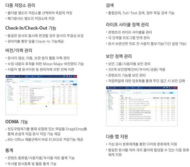 기업 내에 업무 수행 중 발생되는 다양한 형식의 문서, 이미지, 오디오 등의 콘텐트를 문서 집중화를 통해 보관의 신뢰성 및 유통의 보안성을 유지하고, 이를 토대로 안정적이며 편리한 서비스를 제공하며 문서함별로 저장소를 선택하여 보관 가능 - 정보 접근의 편리성