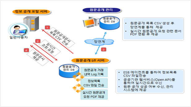 DMZ 구간에는 I/F 서버만 구성하고, 원문공개 관리 시스템은 내부에 구축하여 자료 유출 방지