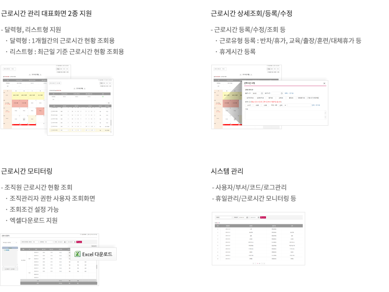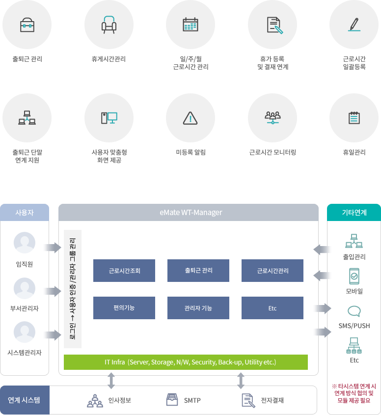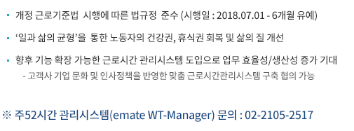 eMate WT-Manager는 ‘일과 삶의 균형’을 지향하는 근로 환경 변화를 적용한 근로자, 조직 관리자 중심의 근로시간관리 솔루션입니다. 사용자는 본인의 근로시간을 관리하고 관련된 일반 통계를 확인할 수 있으며 조직관리자는 근로시간 모니터링하고 의사결정의 참고자료를 얻을 수 있습니다. 또한, 새롬정보시스템은 다년간의 기업 비즈니스 경험을 통해 HR관련 기업별 특성에 맞는 별도의 맞춤서비스를 제공하여 근로시간 관리 관련 효율성과 생산성을 제고할 수 있는 관리플랫폼을 제공합니다.